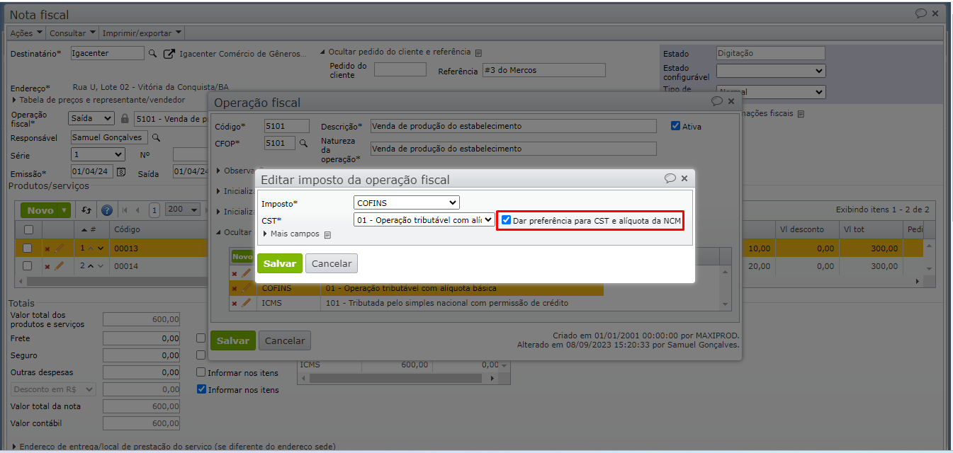 A alteração automática do CST e alíquota de determinado imposto no momento da emissão da nota fiscal somente ocorre se o parâmetro “Dar preferência para CST e alíquota da NCM” estiver marcado na configuração desse imposto na operação fiscal e houver CST e/ou alíquota fixada para esse imposto no cadastro da NCM.