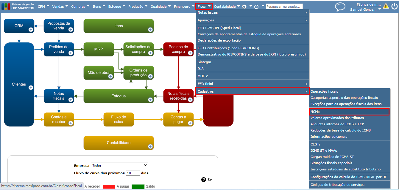4) Para verificar se o CST e/ou alíquota se encontra fixado no cadastro da NCM, acesse o menu superior “Fiscal > Cadastros > NCMs”.
