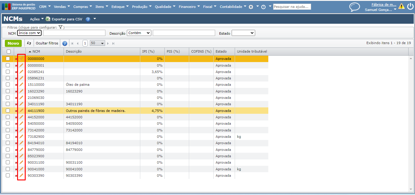 5) Localize a NCM na grade e clique no ícone do lápis para editar.
