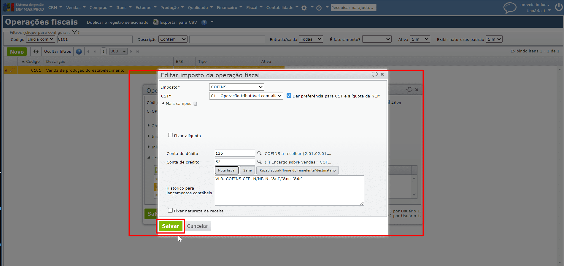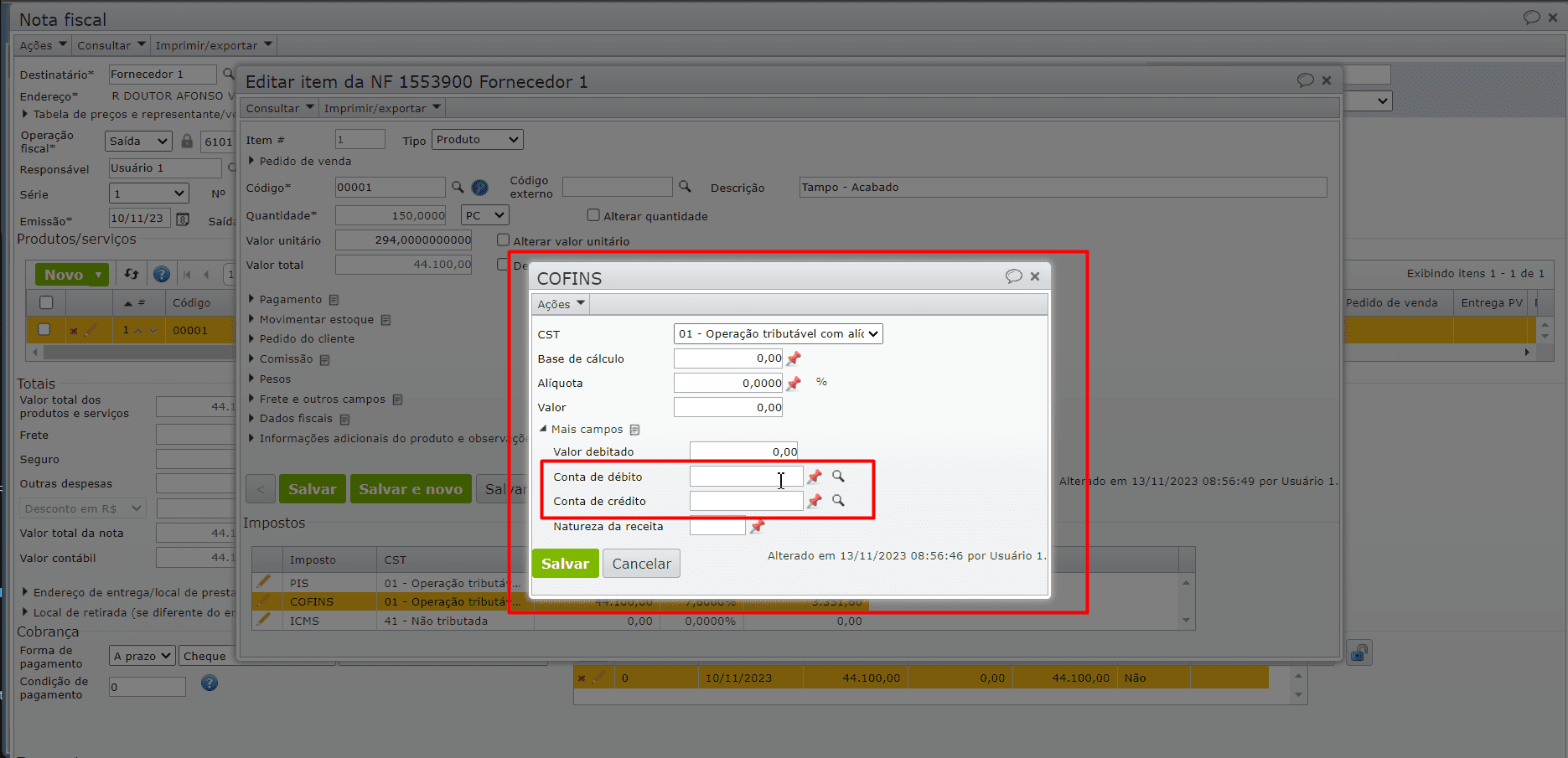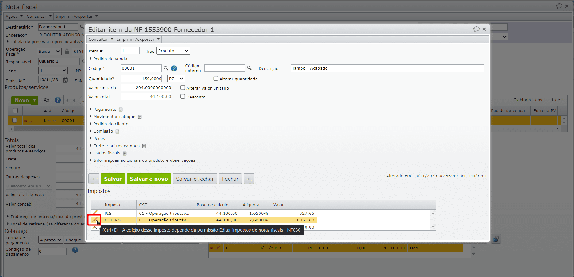 e) Salve o item através do botão cinza “Salvar e fechar“, emita a NF novamente e verifique se os lançamentos foram registrados.