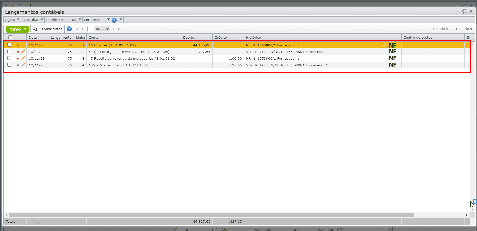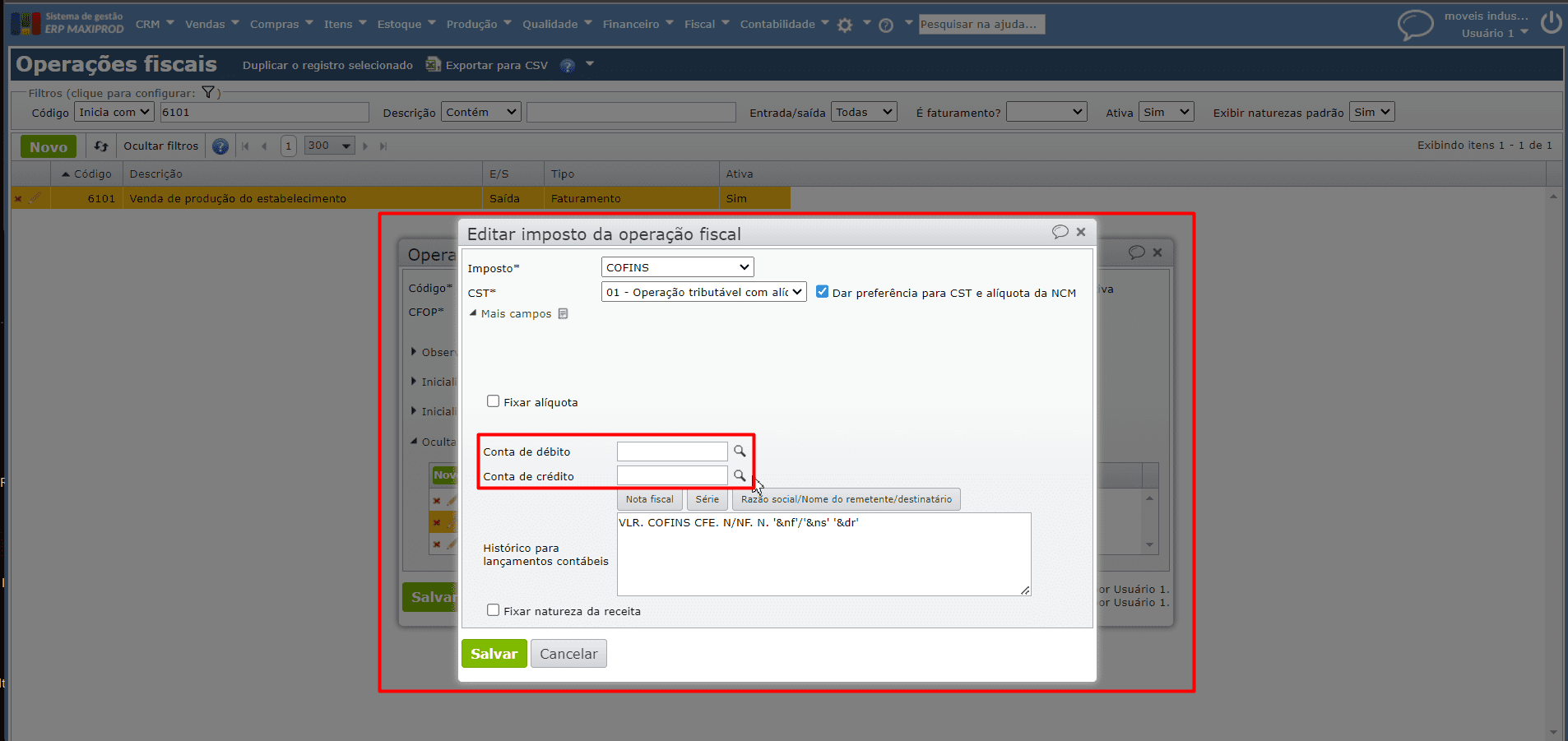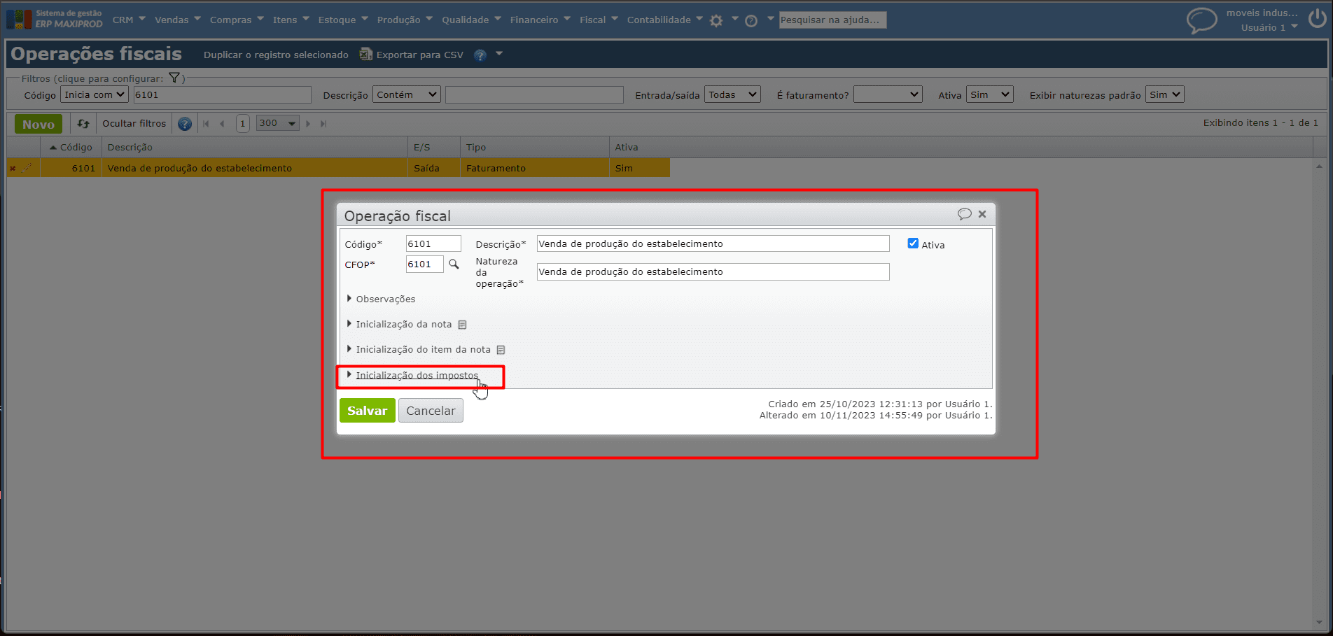 e) Salve o item através do botão cinza “Salvar e fechar“, emita a NF novamente e verifique se os lançamentos foram registrados.