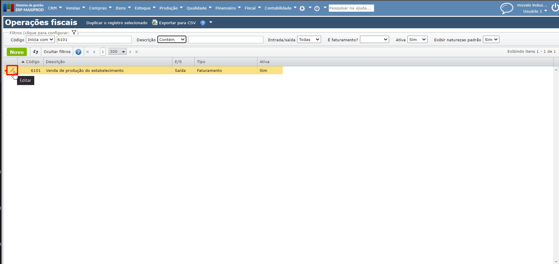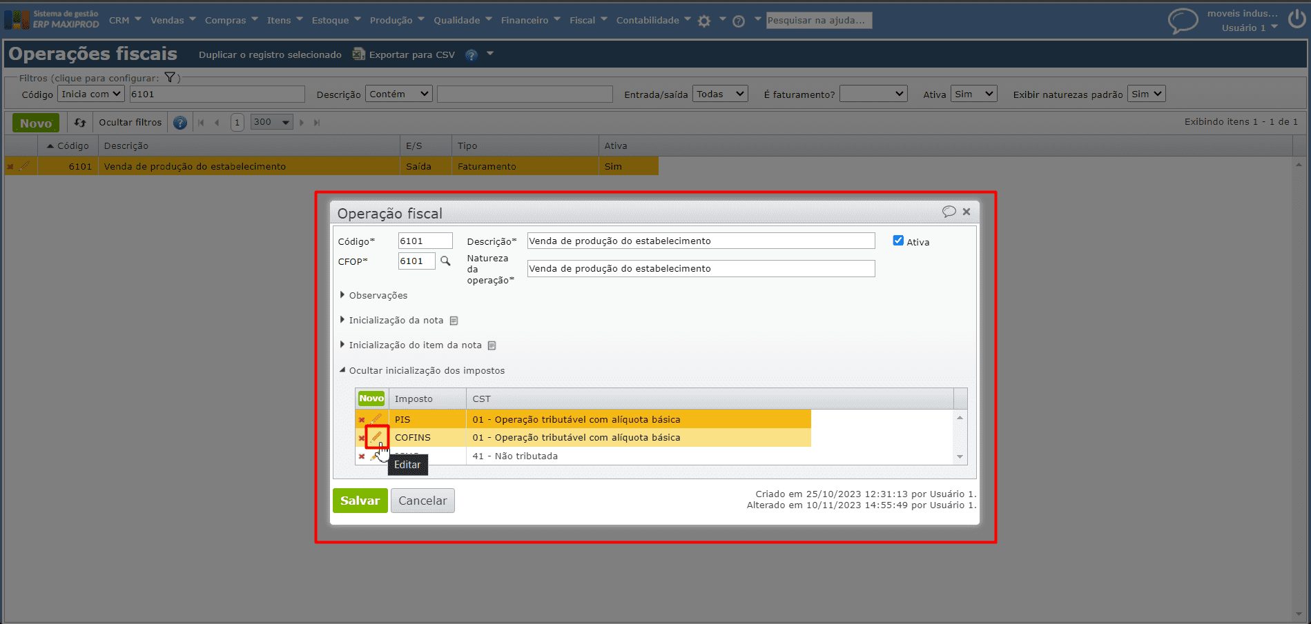 2) Identifique a operação fiscal utilizada na NF que apresentou o problema e clique sobre o ícone “lápis laranja” para abrir sua edição.