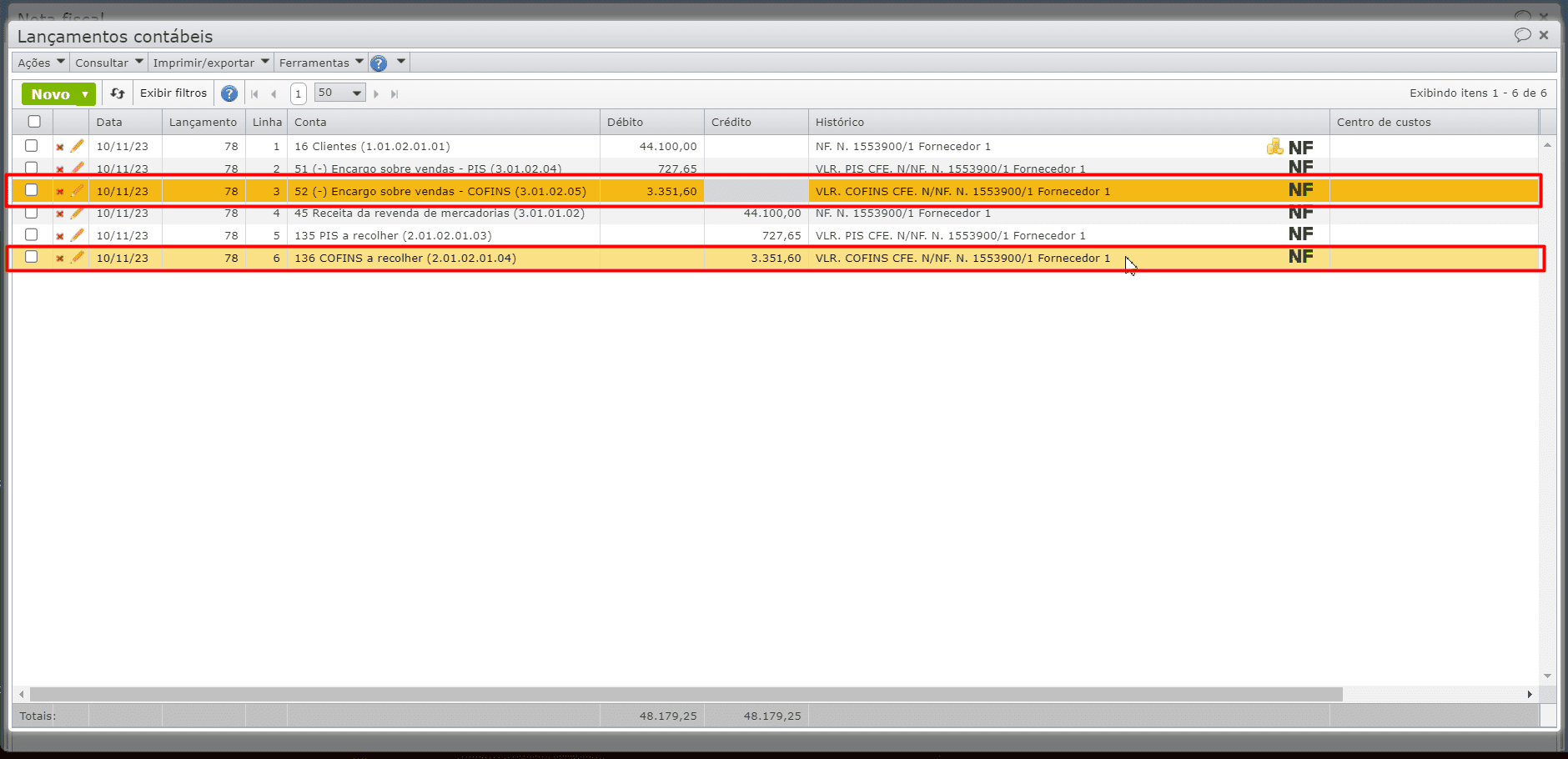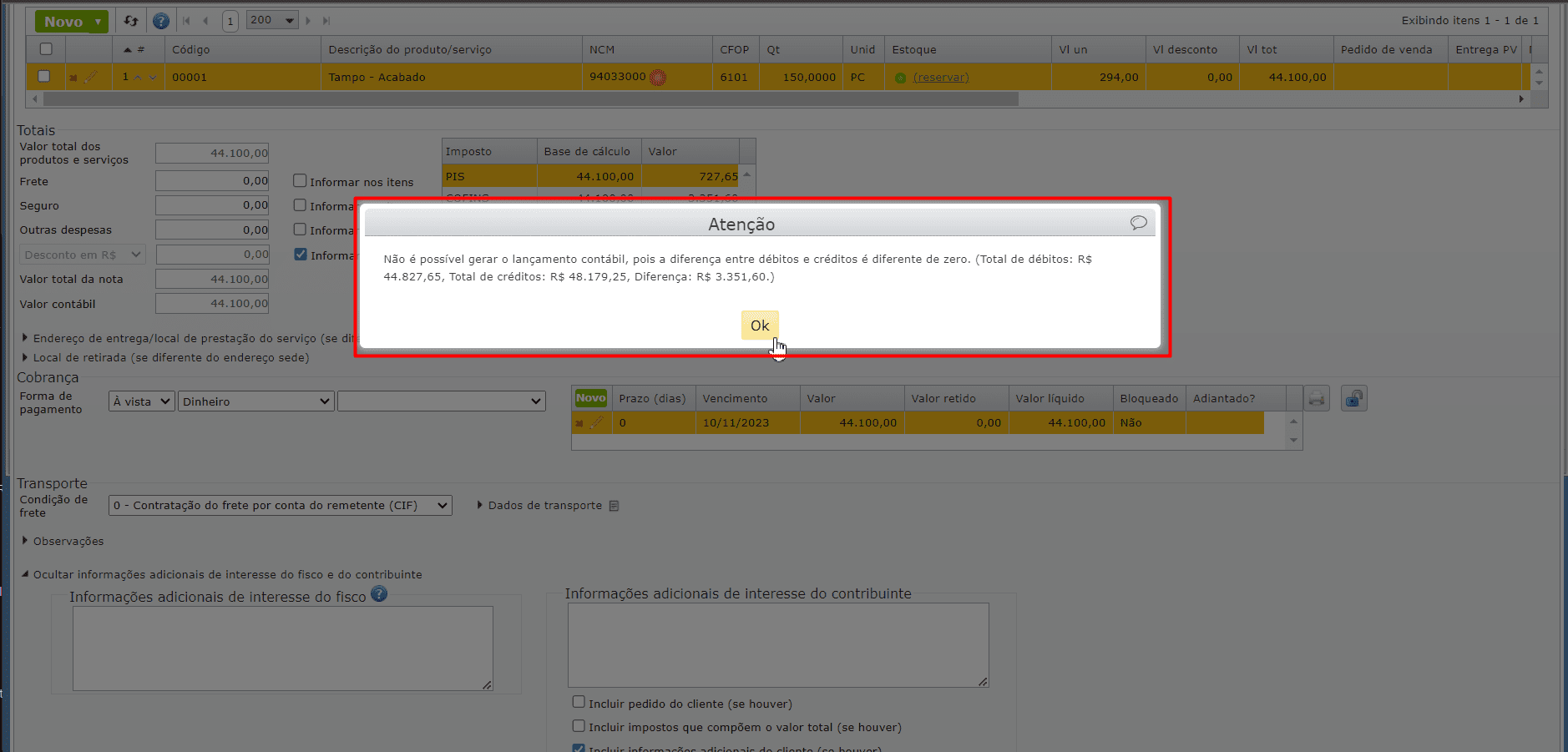 b) No entanto, após a emissão/recebimento da NF, verifica-se que o imposto “COFINS” não gerou um lançamento.
