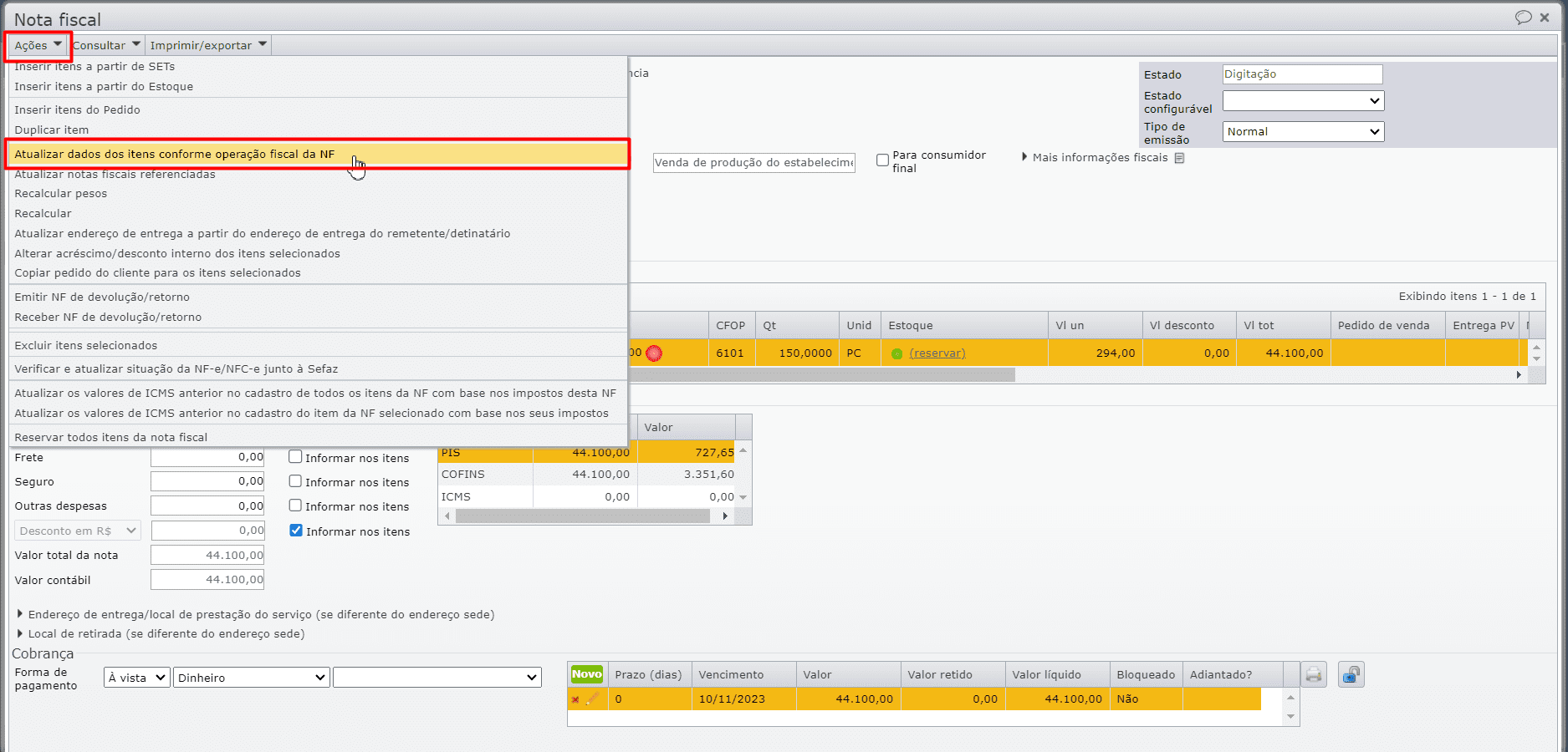 7) A seguir, acesse a edição da NF que estava apresentando o problema, e clique no menu “Ações > Atualizar dados dos itens conforme operação fiscal da NF”.