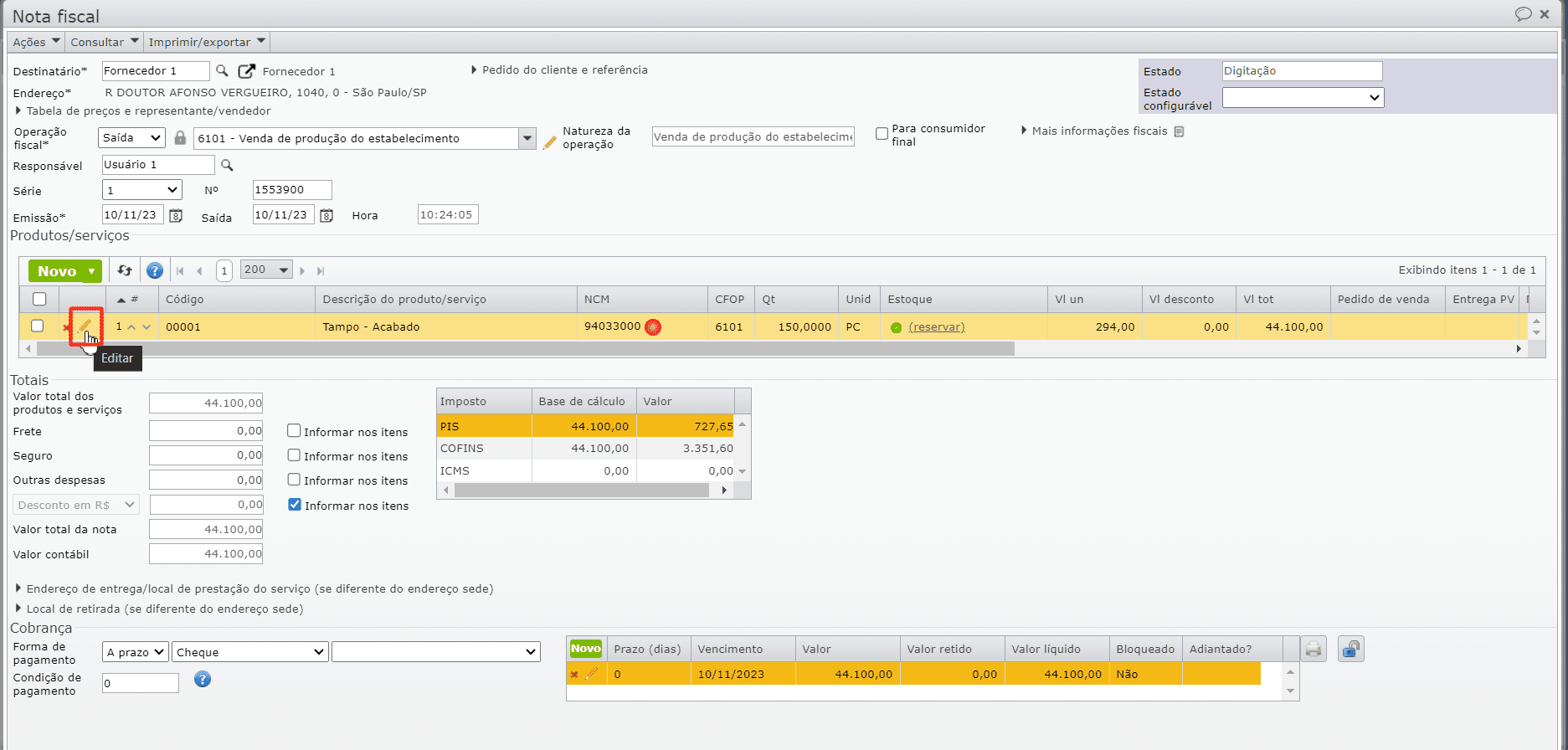 a) Acesse a edição do item da NF, clicando no ícone “lápis laranja” da seção “Produtos/Serviços“.