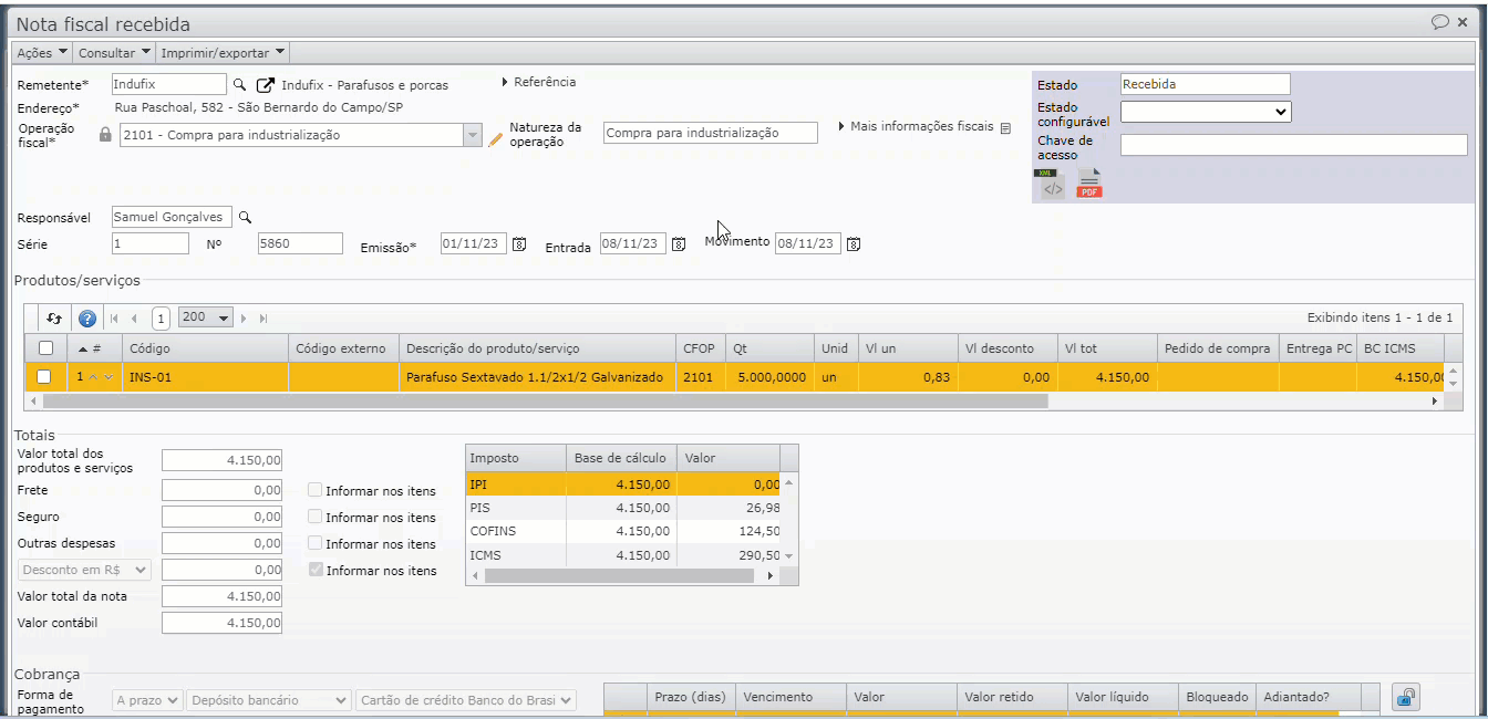 No recebimento da nota fiscal, o código interno do item identifica o produto, mercadoria ou serviço, previamente cadastrado em “Itens > Itens”. O código interno é formado por caracteres alfanuméricos e pertence à relação de itens da própria empresa. Para saber mais sobre propriedades de itens, clique aqui. Quando a nota movimenta estoque e, este código é informado incorretamente, o item que entra no estoque no sistema é diferente do item que entra no estoque físico, gerando discrepâncias.