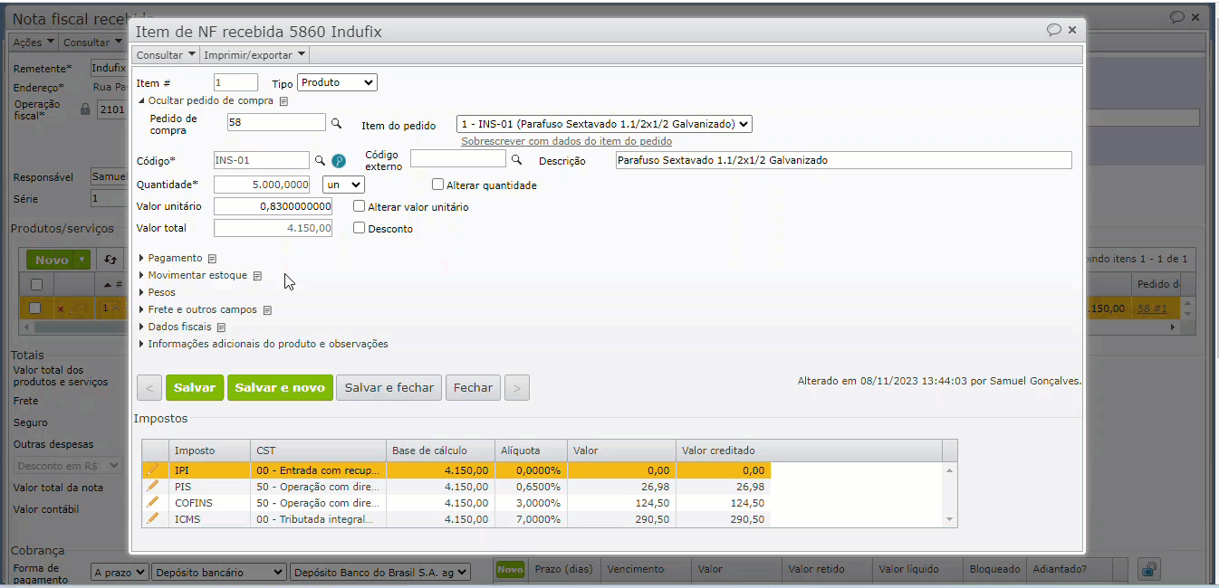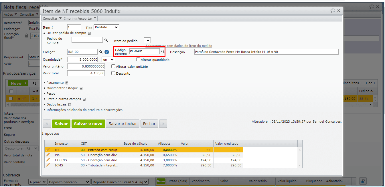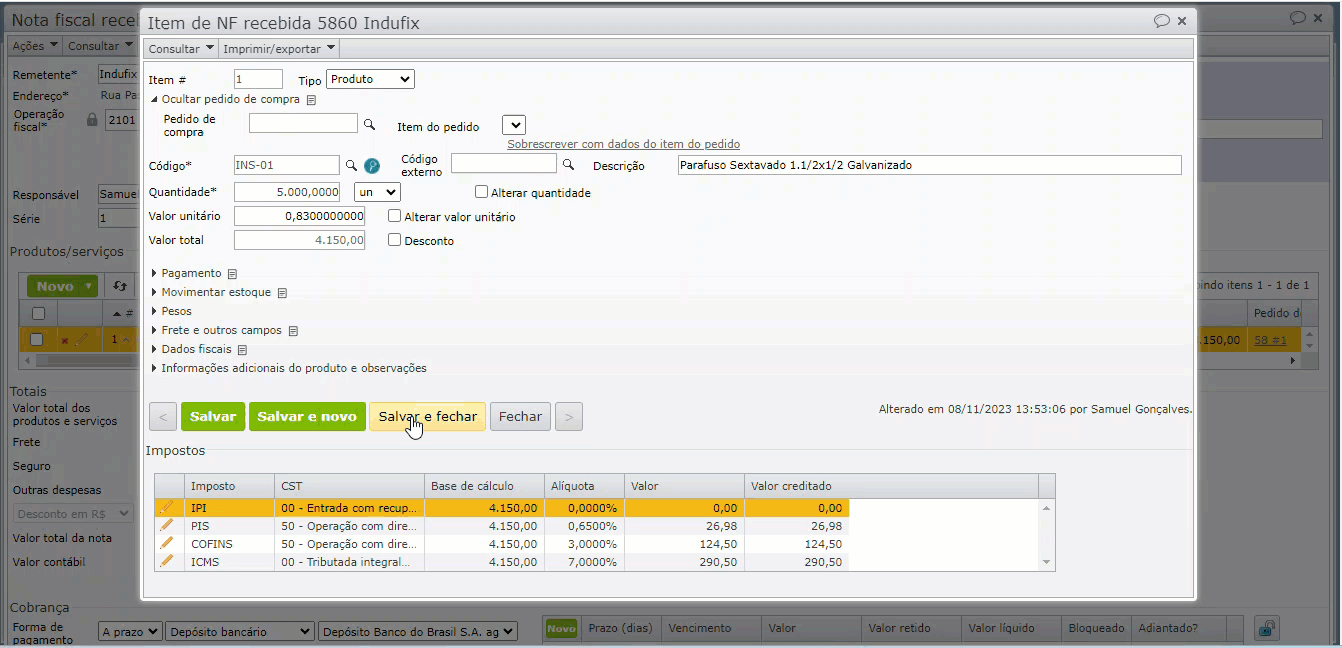 b) A seguir, clique em um dos botões “Salvar” para guardar as alterações. De preferência utilize o botão cinza “Salvar e fechar”, por ser necessário fechar e abrir novamente a edição do item da nota recebida para que o campo “Código” se torne editável.