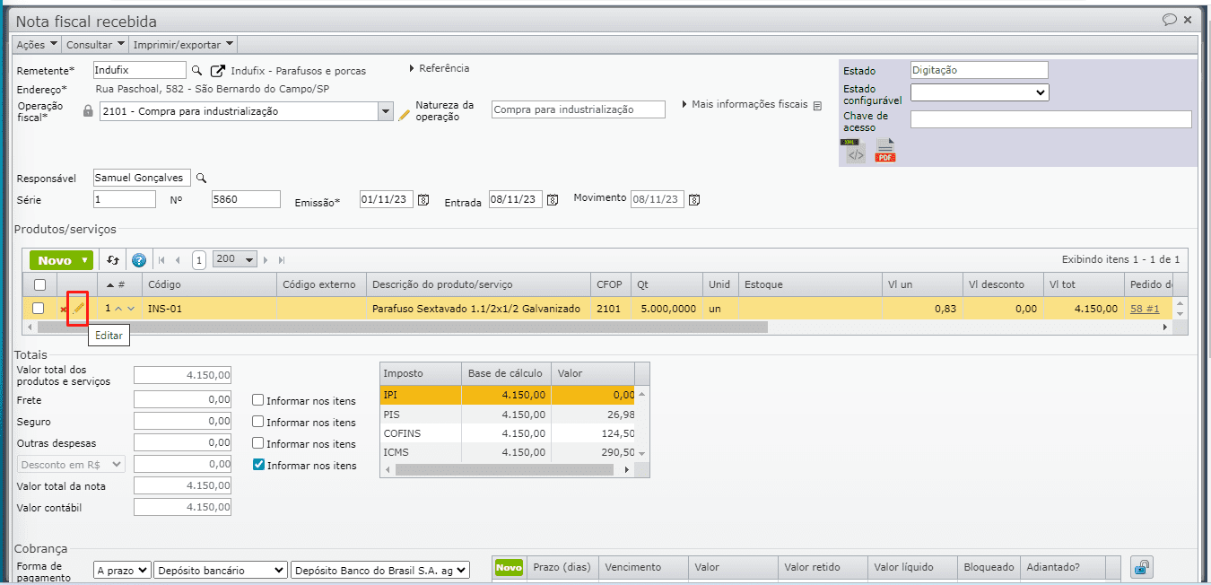 2) Quando a nota fiscal recebida estiver no estado de “Digitação”, edite o item da nota que está com o código interno incorreto. Para isso, na grade de produtos/serviços, clique no ícone do lápis da linha do item.