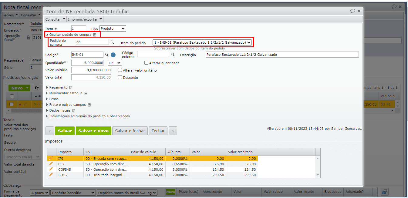 5) Após alterar o código do item, se necessário, vincule o item da nota recebida ao item do pedido de compra correto, para que o estado do item do pedido de compra seja alterado conforme o recebimento da nota. Para saber mais sobre vínculo entre itens de notas recebidas e itens de pedidos de compra, clique aqui.