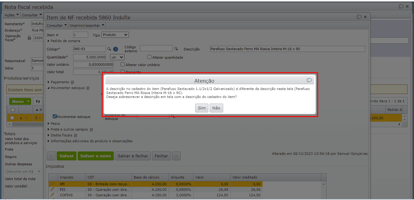 4) Altere no campo “Código”, o código do item, para a opção correta. O sistema apresentará algumas mensagens questionando se deseja alterar a NCM, descrição, valor unitário, etc. Verifique quais destes campos devem ser alterados. Clique em “Sim” para alterar e em “Não” para manter.