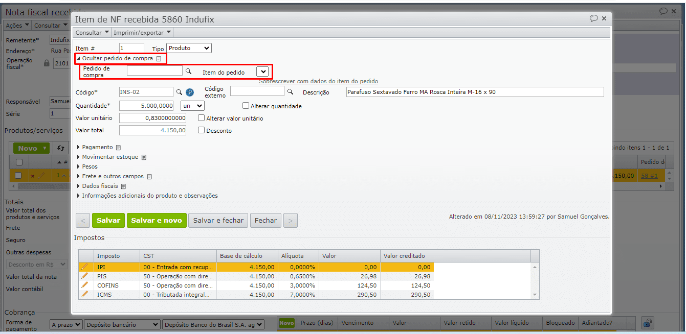 a) A vinculação pode ser automática ou manual. Para fazer a vinculação manual, expanda a seção “Pedido de compra” na edição do item da nota e preencha os campos “Pedido de compra” e o campo “Item do pedido”.