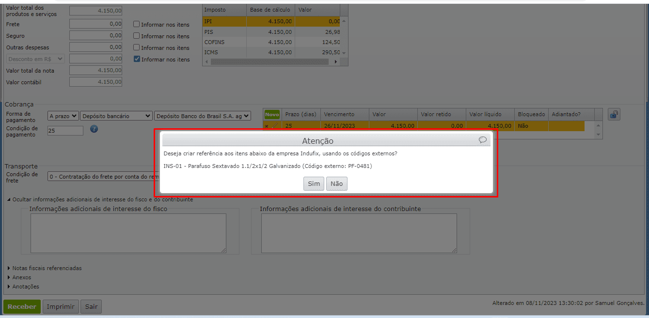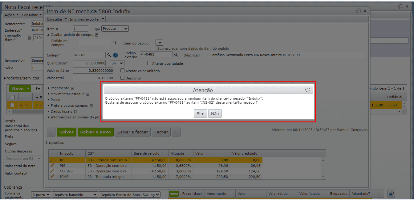 c) No recebimento da NF, se o código externo do item ainda não está associado a nenhum item deste cliente/fornecedor em questão, o sistema exibe uma mensagem perguntando se deseja associar o código externo ao código interno. Se ambos os códigos estão corretos, clique em “Sim” para criar a associação.