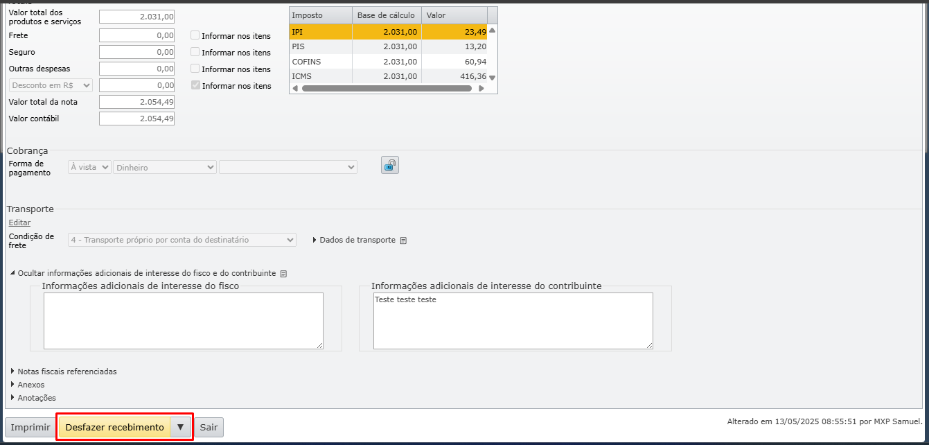 a) Para excluir uma NF recebida, ela deve estar no estado “Digitação”. Portanto, se a nota foi recebida, será necessário clicar em “Desfazer recebimento” na parte inferior da tela de edição da nota. Para saber mais, clique aqui.