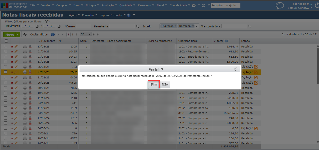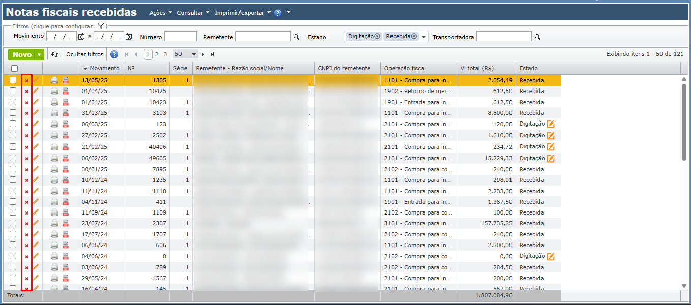 b) Para excluir uma NF recebida, clique no ícone do “x” vermelho da linha da nota a ser excluída.