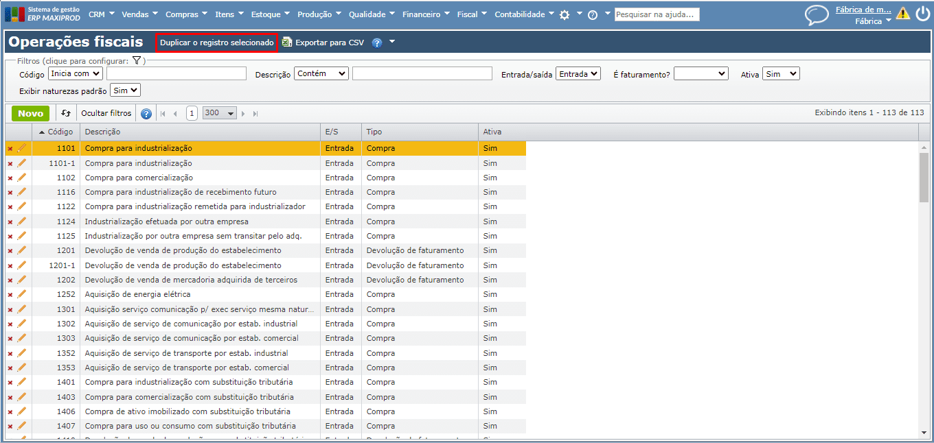 a) Quando há necessidade de parametrizar mais de uma operação fiscal para a mesma CFOP, selecione a operação fiscal que contém a CFOP, e acesse a opção “Duplicar o registro selecionado”.