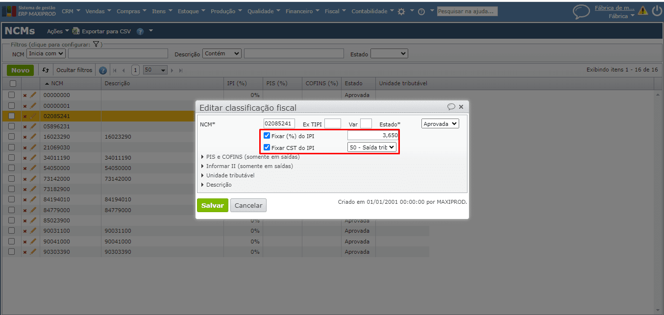 5) Verifique no cadastro das NCMs dos itens da nota, se a CST e alíquota estão fixadas para o imposto IPI. Para isso: