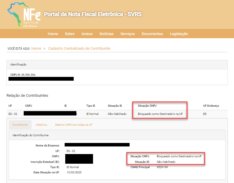 Quando é emitida uma NF-e (modelo 55) e a situação do destinatário no CCC (Cadastro centralizado de contribuintes) é “Bloqueado”, haverá rejeição pelo motivo 305 – Destinatário bloqueado na UF.