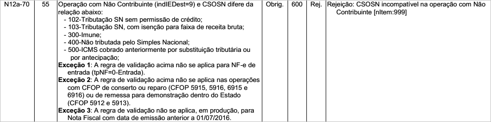 Ao emitir uma NF-e para um destinatário cadastrado como “Não contribuinte” e, com o ICMS diferente da relação abaixo, é retornada a rejeição “600- CSOSN incompatível na operação com Não Contribuinte”: