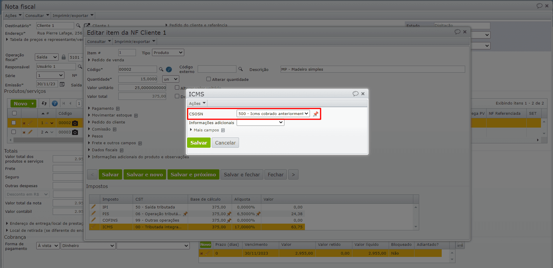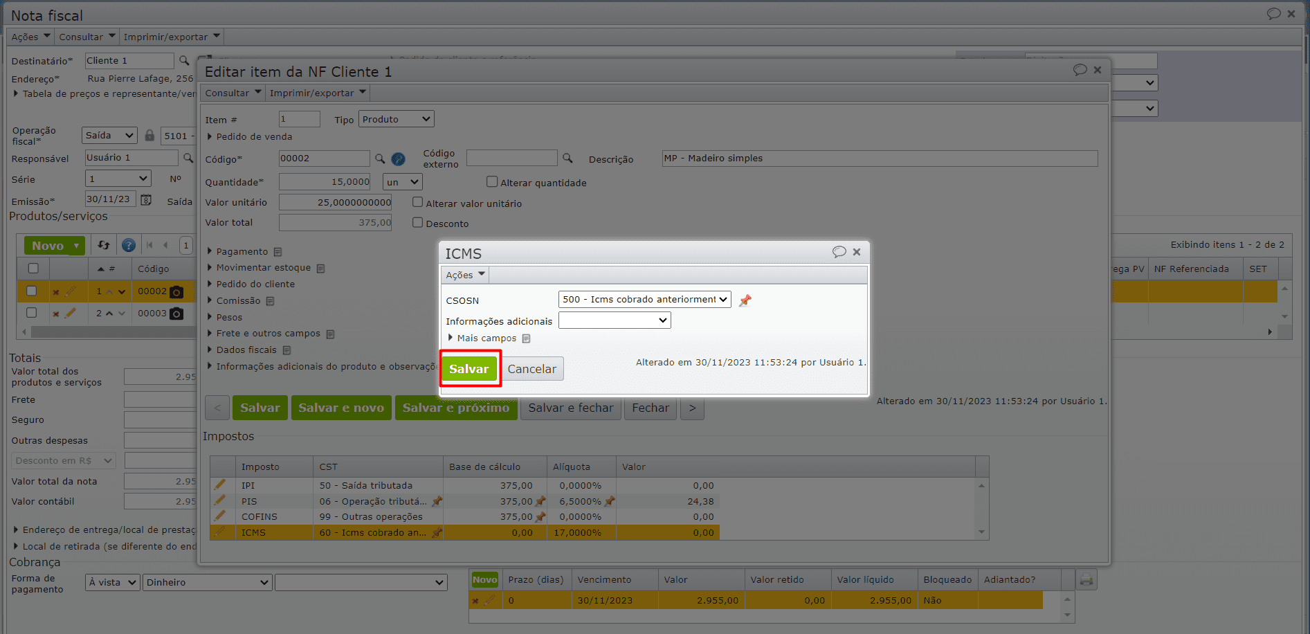 5) Após selecionado o CSOSN no item da NF, clique no botão verde “Salvar“.