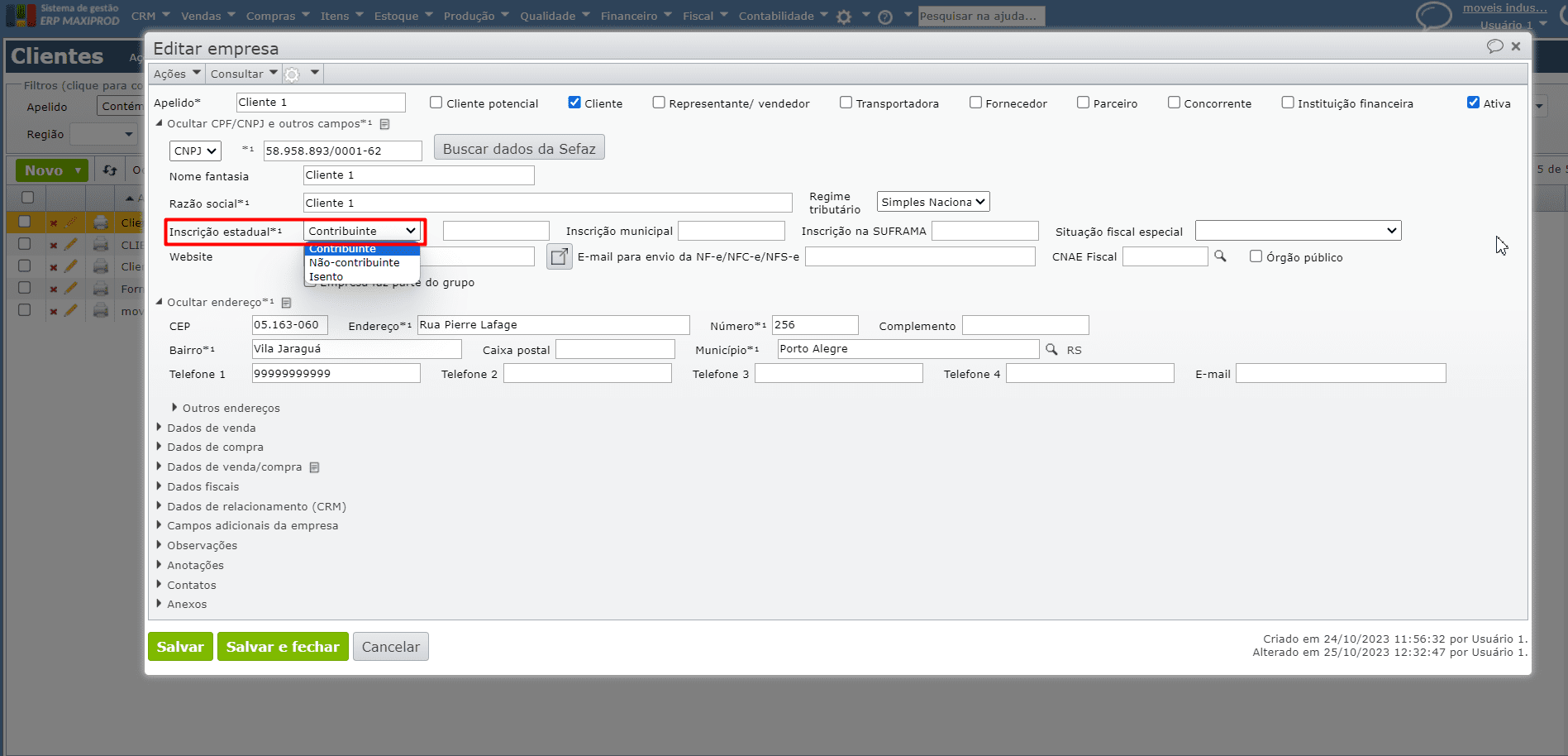 1) Corrija o cadastro da empresa selecionando a opção “Contribuinte“, e salve as alterações usando o botão verde “Salvar e fechar“.
