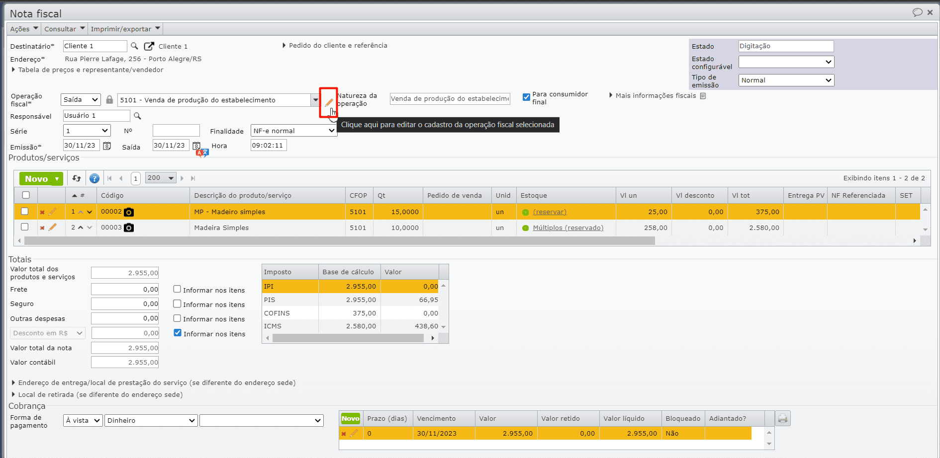 a) Na edição da NF, clique no ícone “lápis laranja” à esquerda da “Natureza da operação“.
