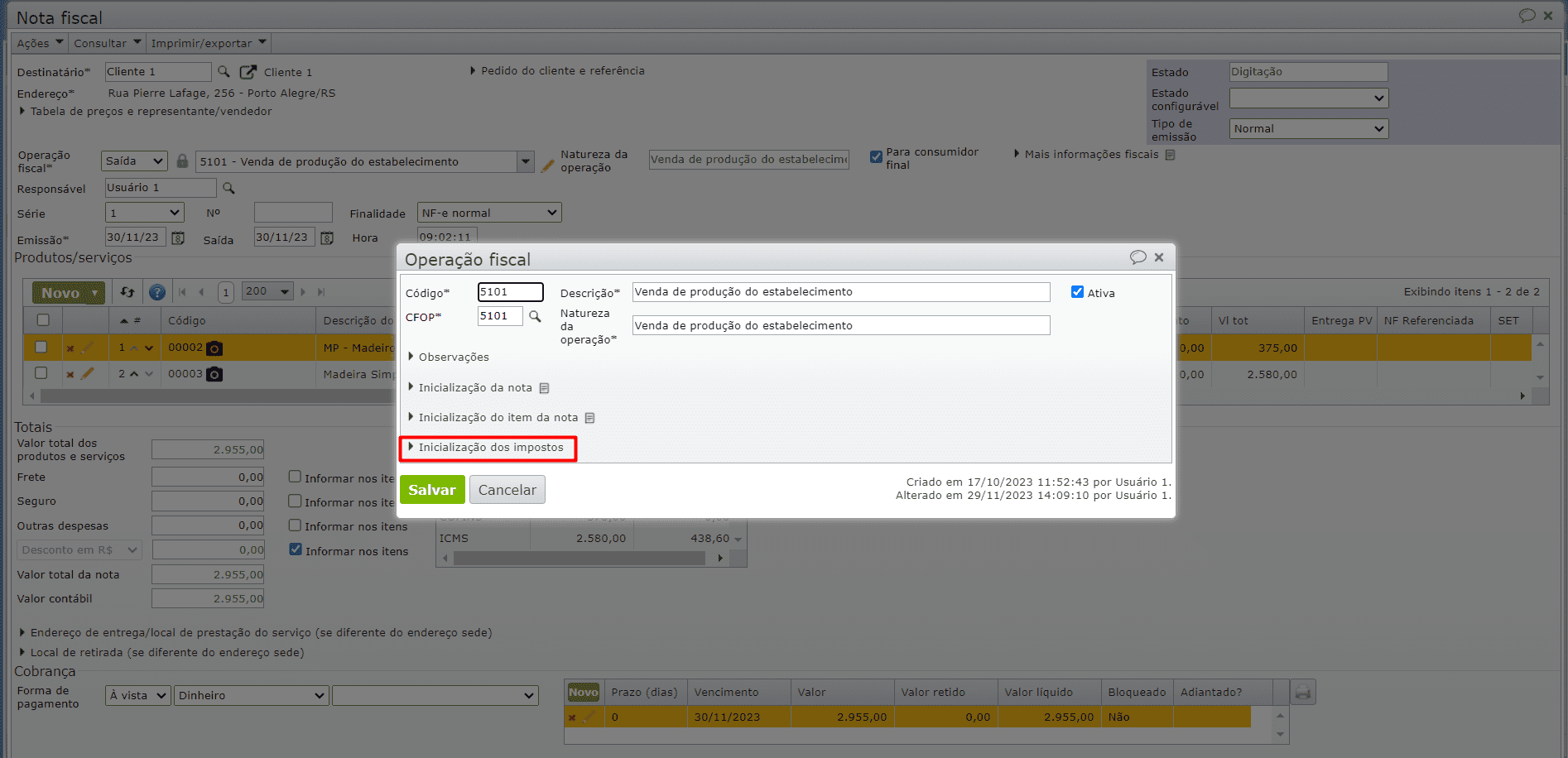 b) É aberta a edição da Operação Fiscal. Clique na seção “Inicialização dos impostos”.