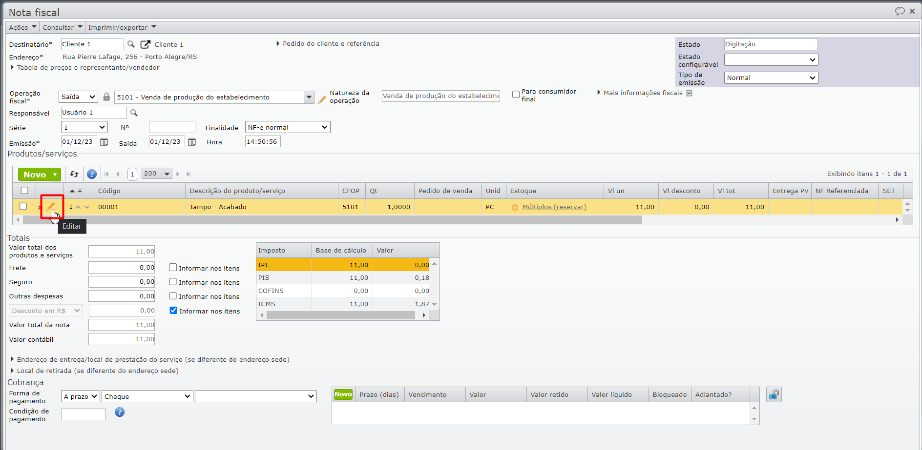 2) Após verificar, acesse a edição da NF e clique no ícone “lápis laranja” do item para abrir sua edição.