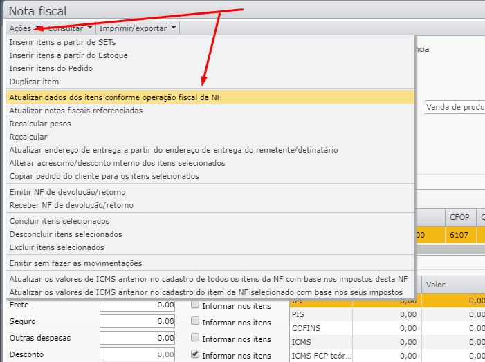 4) Após incluir os impostos na operação fiscal, vá até a NF rejeitada > Desfaça sua emissão > Acesse o menu Ações > Atualizar dados dos itens conforme operação fiscal da NF.