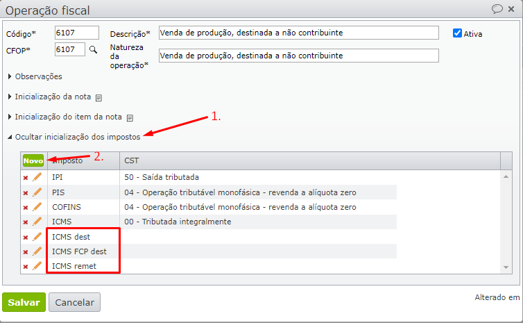 3) Na edição da operação fiscal, vá ao menu Inicialização dos impostos > Botão Novo > Inclua os impostos ICMS dest, ICMS FCP dest e ICMS remet.