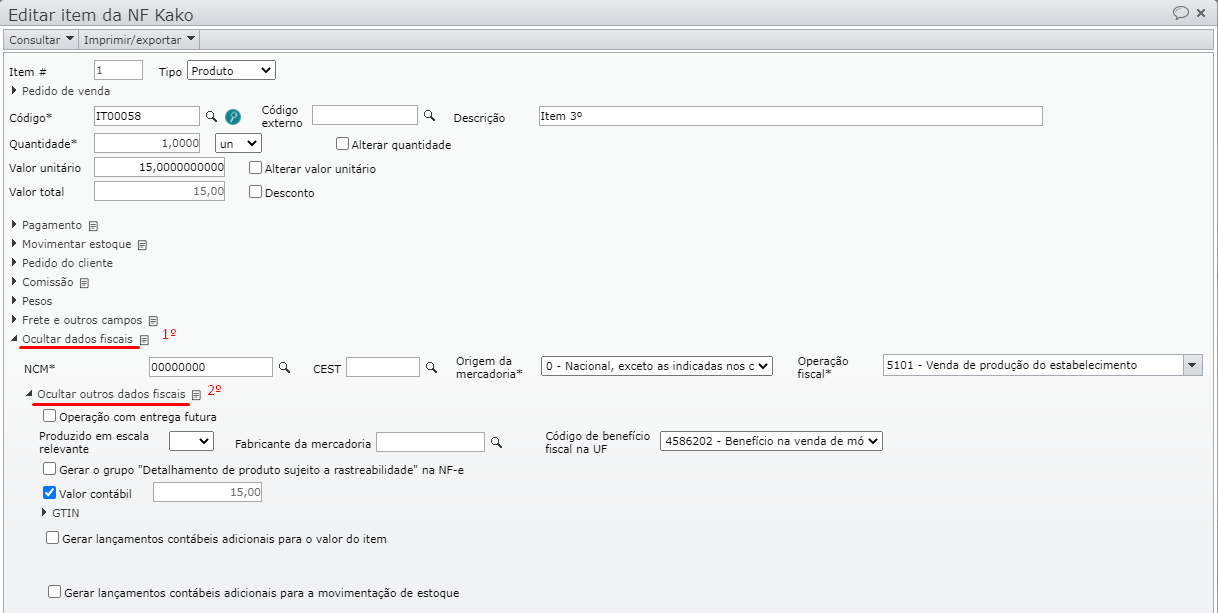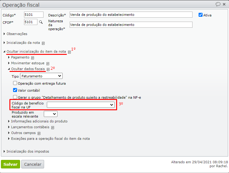 3.2. Para remover o Código do benefício fiscal, expanda o menu “Inicialização do item da nota” e deixe o campo Código de benefício fiscal em branco.