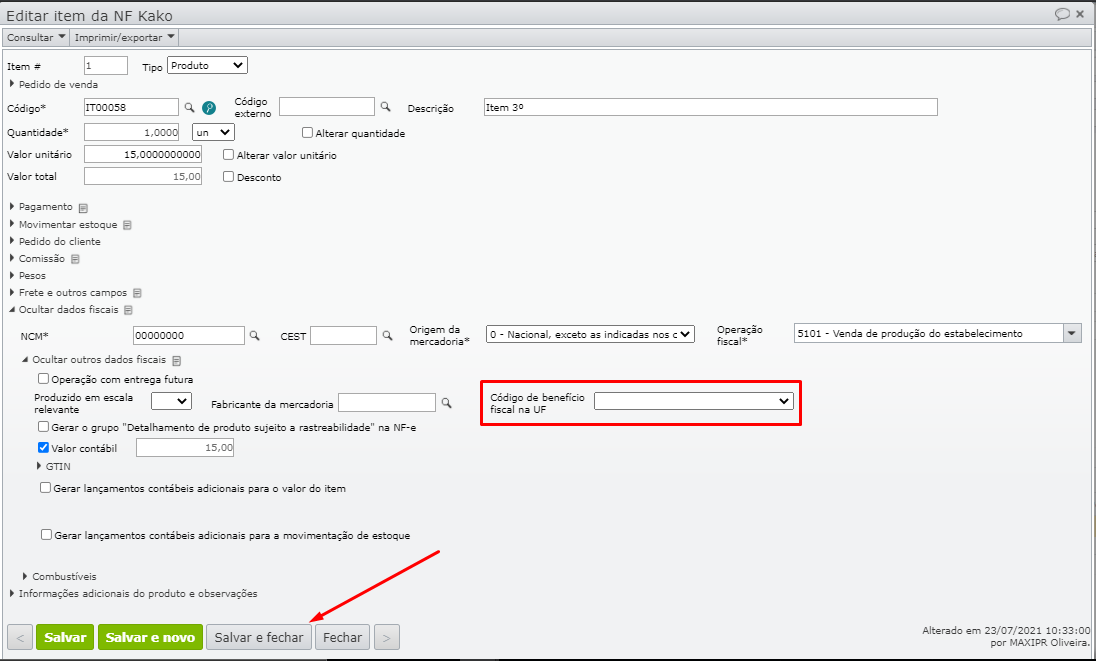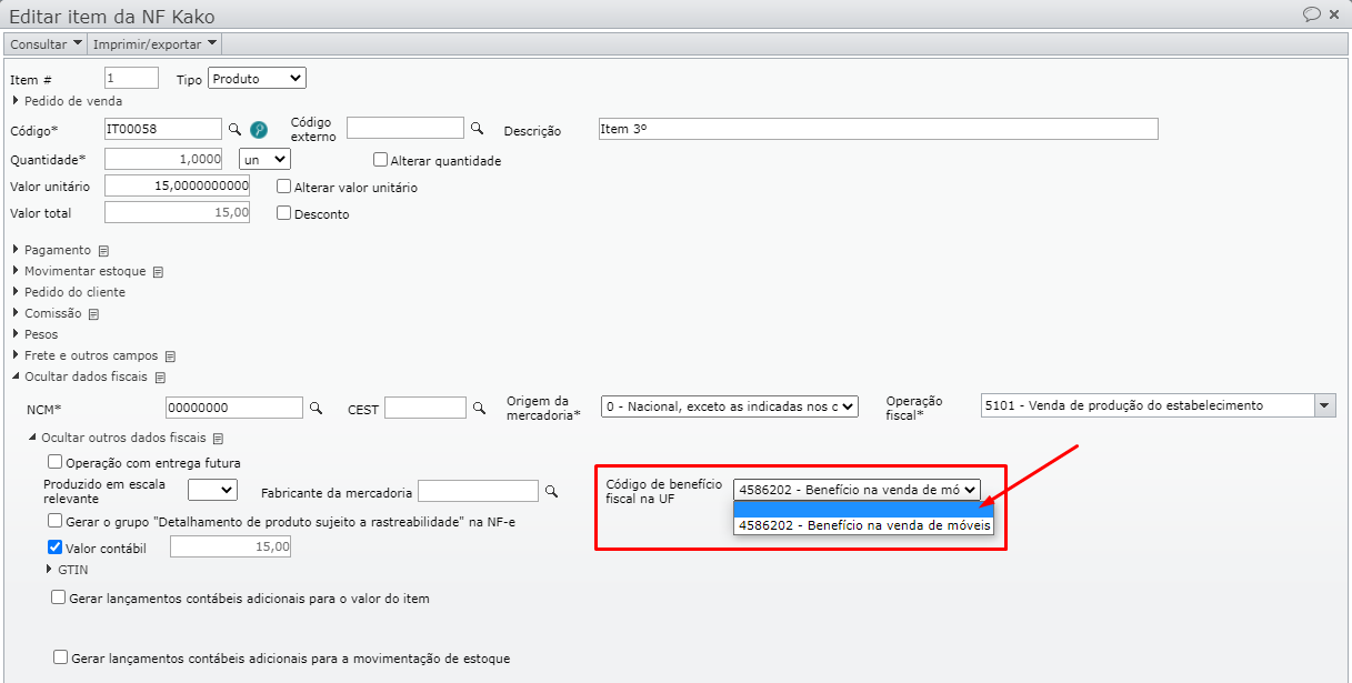 4. No campo Código de benefício fiscal, selecione a opção em branco. Desse modo, o item deixa de ter um Código de benefício fiscal.