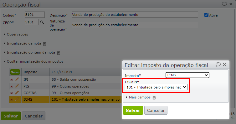 3.1. Para editar o CST do ICMS, expanda o menu “Inicialização dos impostos” e clique para editar o ICMS. Na edição do ICMS, altere o código do CST.