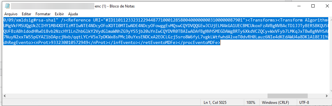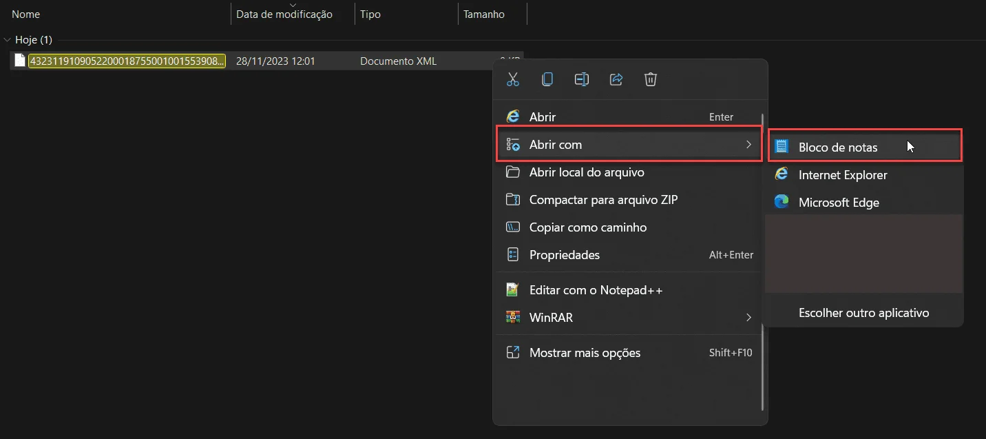 2) Localize o arquivo XML baixado no seu computador, clique nele com o botão direito do mouse e selecione “Abrir com > Bloco de notas”.