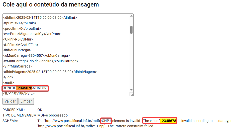 No exemplo mostrado no passo 6, ao validar o XML, foi exibido um erro no CNPJ com o valor “12345678”, isto indica que o CNPJ informado está inválido. Neste caso, é necessário acessar o cadastro da empresa no sistema, localizar o campo de CNPJ e preenchê-lo corretamente. Após a correção, gerar e enviar novamente o MDF-e para validação.