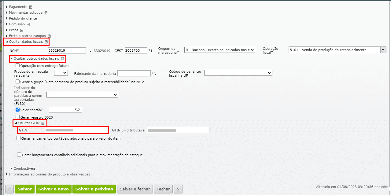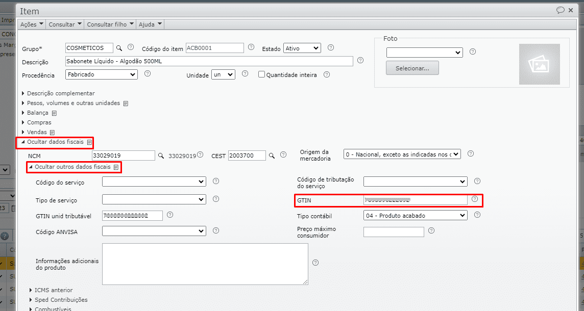 3) Em seguida, desfaça a emissão da NF e edite o item. Na tela de edição do item da nota, expanda a aba “Dados fiscais” > “Outros dados fiscais” > “GTIN”, e veja o código GTIN preenchido: