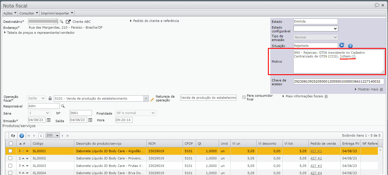 2) É preciso verificar se o GTIN preenchido no item da nota está configurado corretamente. Para isso, veja para qual item da nota a mensagem de rejeição aponta:
