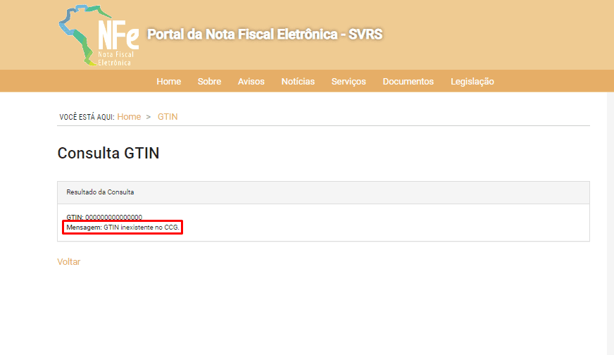 5) Provavelmente o retorno para a busca será “GTIN inexistente no CCG.”. Logo, é importante que os donos de marcas que possuem produtos com GTIN em circulação no mercado mantenham atualizados os dados cadastrais de seus produtos no CNP da GS1 Brasil (cnp.gs1br.org), para manter atualizado também o Cadastro Centralizado de GTIN (CCG), facilitando assim as validações.