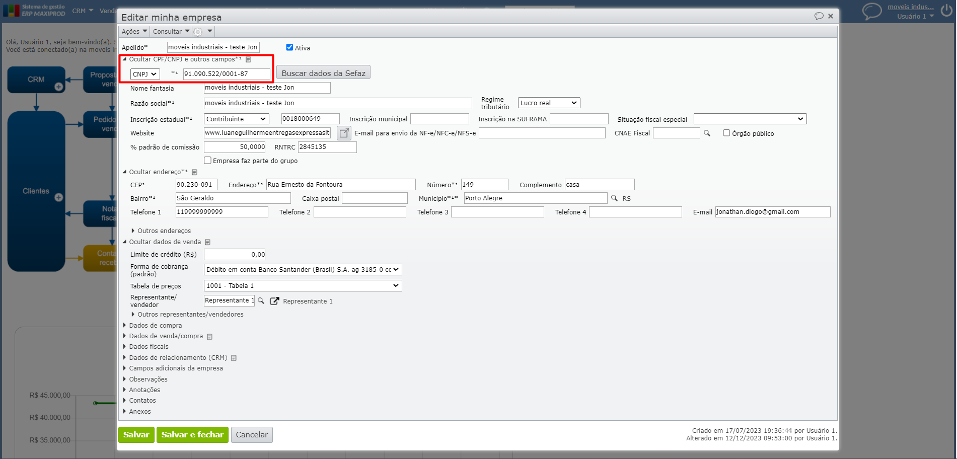 2) Verifique se o CPF/CNPJ da empresa está preenchido corretamente. Caso não esteja, corrija-o, clique no botão verde “Salvar e fechar” e envie a NF novamente.
