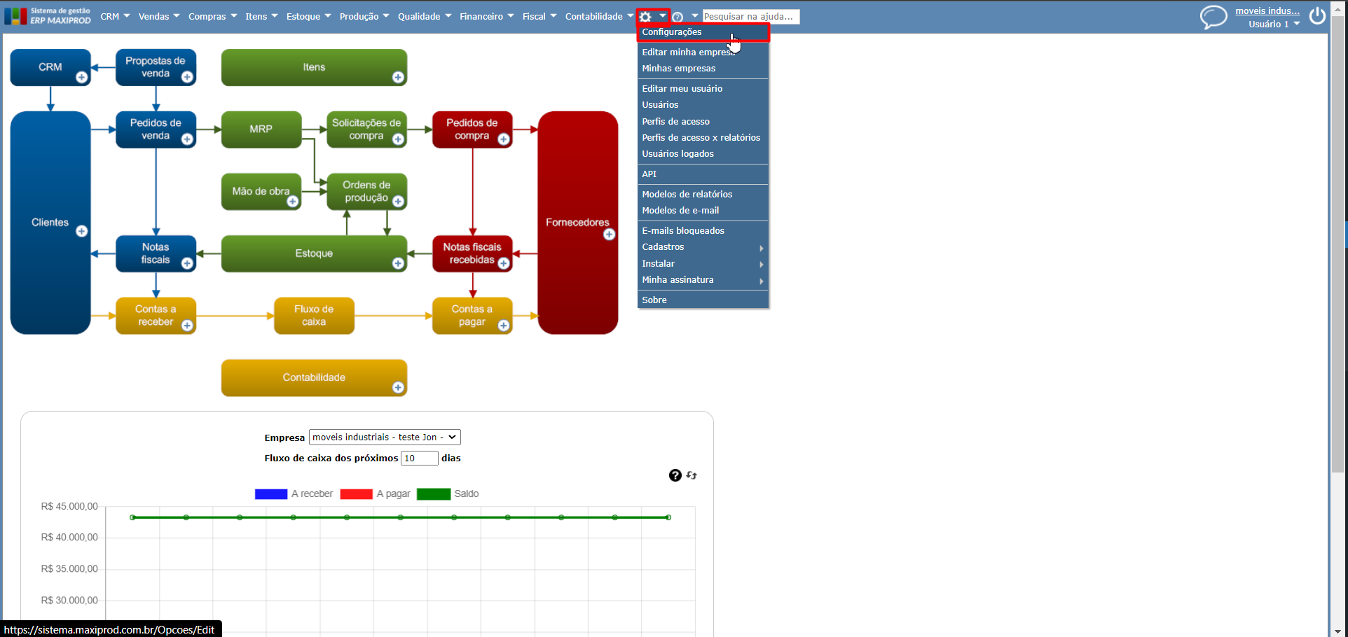3) Caso esteja correto, o problema está no certificado digital configurado, sendo necessário importar um novo certificado. Para isso, acesse o menu “Roda dentada” > “Configurações”.