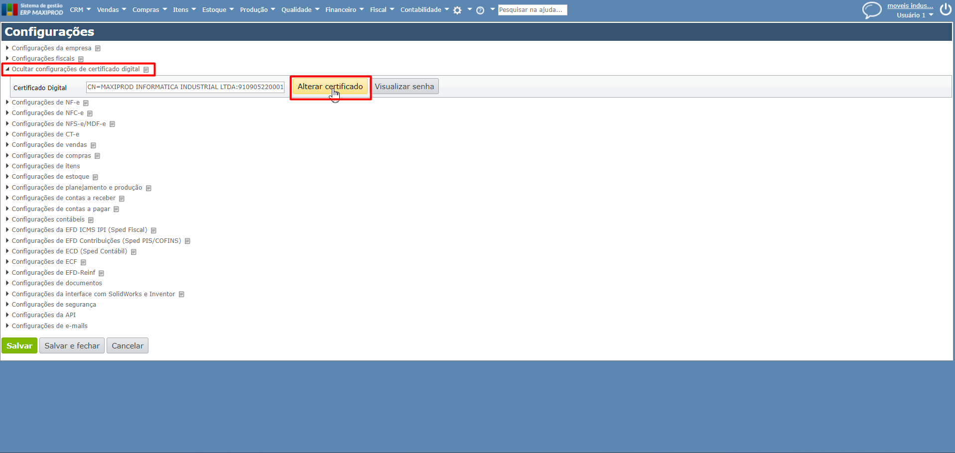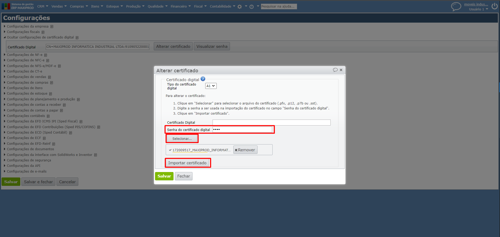 5) Na tela “Alterar certificado”, clique no botão “Selecionar”, para buscar o arquivo do certificado no computador, certifique-se de que o certificado possue o mesmo CNPJ de sua empresa, informe a senha do certificado, clique em “Importar certificado”, e finalize clicando em “Salvar”.