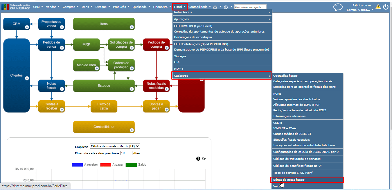 2) Após a verificação da numeração correta, altere o “Próximo número” da série utilizada acessando o menu superior “Fiscal > Cadastros > Séries de notas fiscais”.