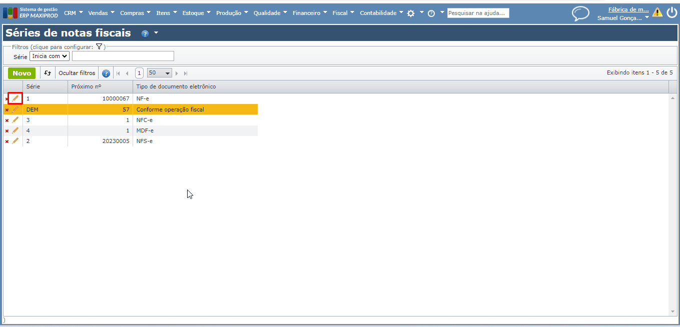 3) Abra a edição da série fiscal clicando no ícone do lápis ou com um duplo-clique na linha.