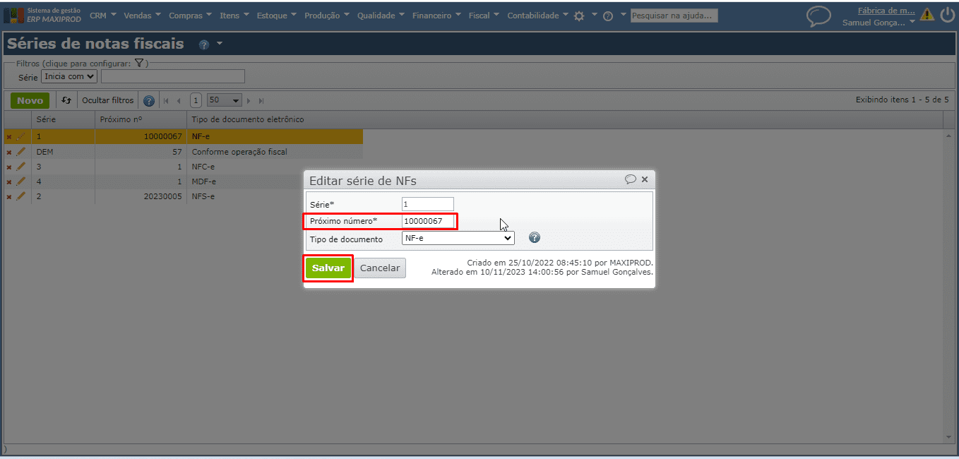 4) Altere o valor do campo “Próximo número” e clique no botão verde “Salvar” para guardar as alterações.