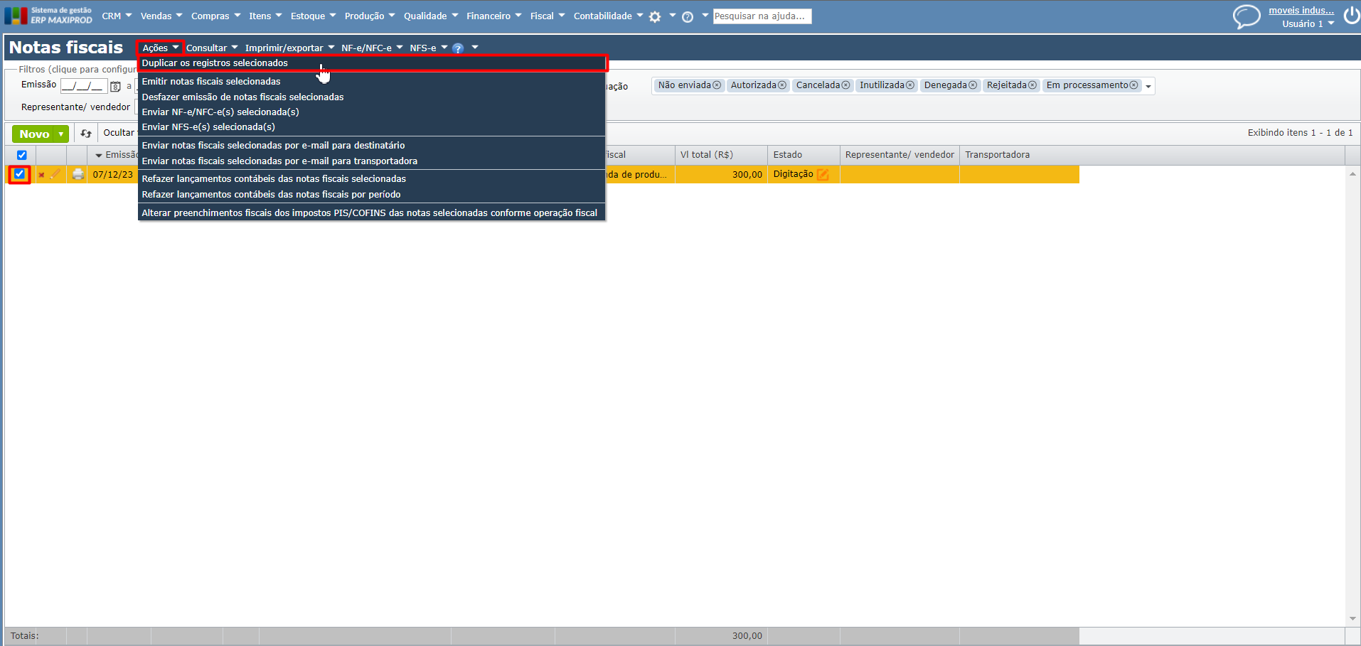 5) Agora, acesse o menu “Vendas > Notas fiscais”, identifique a NF rejeitada, selecione-a através da caixa de seleção e acesse o menu “Ações > Duplicar os registros selecionados”.