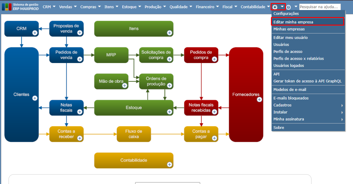 1) Acesse o menu “Roda dentada > Editar minha empresa”.