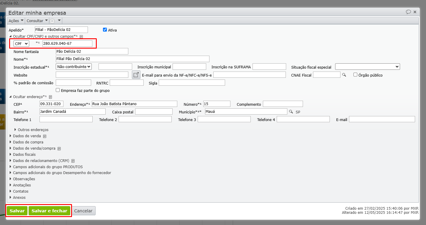 2) Verifique se o CPF da empresa está preenchido corretamente. Se não estiver, corrija-o, clique no botão verde “Salvar e fechar” e envie a NF novamente.