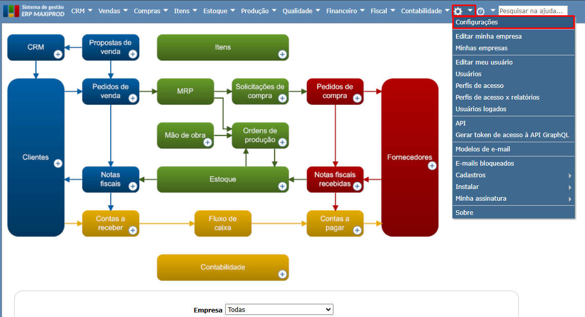 3) Se estiver correto, o problema está no certificado digital configurado, sendo necessário importar um novo certificado. Para isso, acesse o menu “Roda dentada > Configurações”.