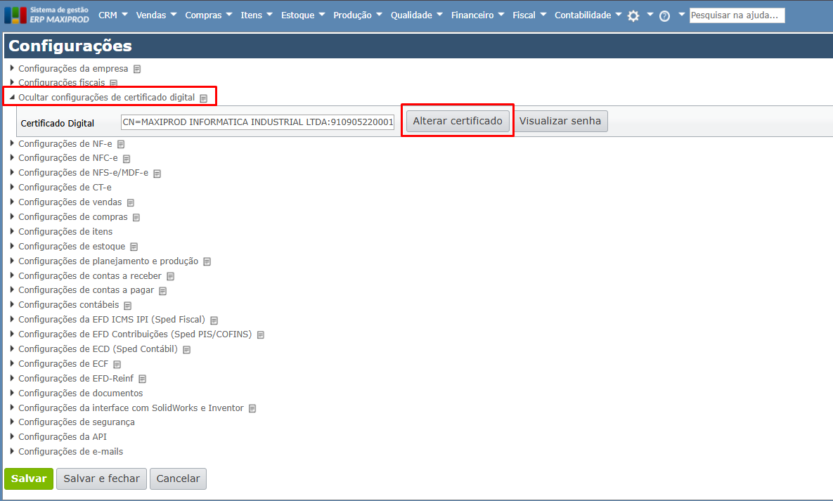 4) Expanda o menu “Configurações de certificado digital”, e clique em “Alterar certificado”.