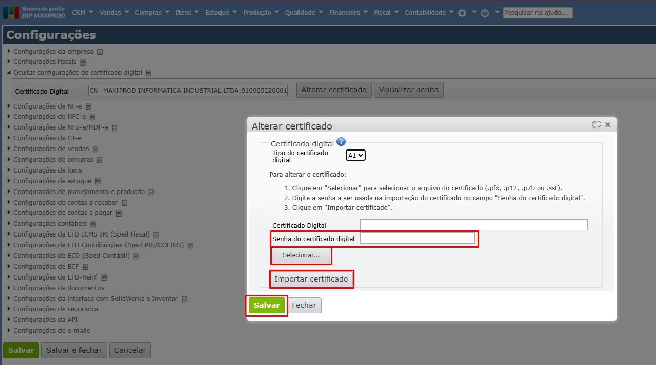5) Na janela “Alterar certificado”, clique no botão “Selecionar” para buscar o arquivo do certificado no computador. Certifique-se de que o certificado possui o mesmo CPF de sua empresa, informe a senha do certificado, clique em “Importar certificado” e finalize clicando em “Salvar”.