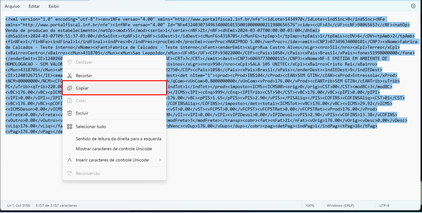5) No bloco de notas, selecione todo o texto, clique com o botão direito do mouse e escolha a opção copiar.